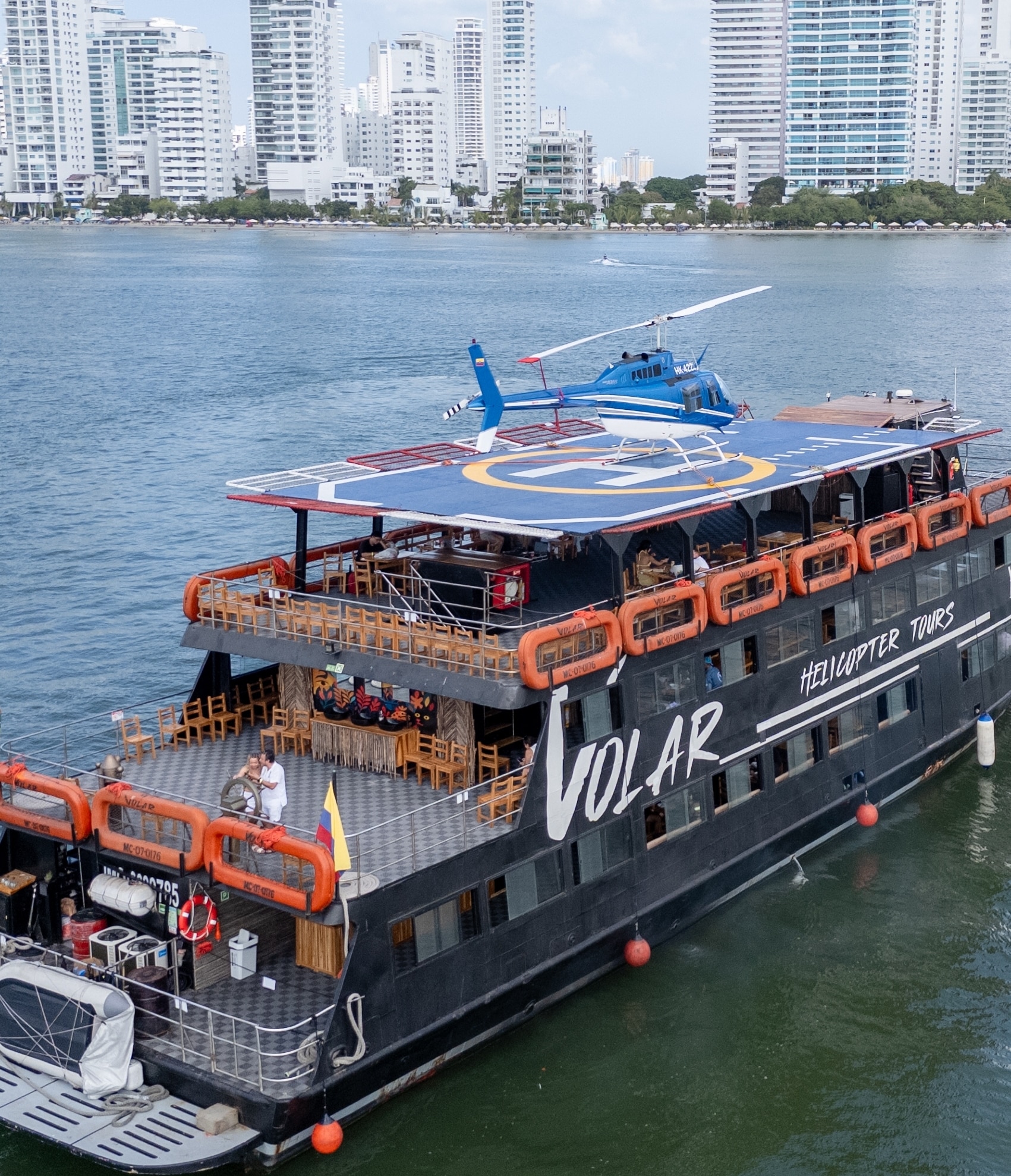 Disfruta un recorrido exclusivo por la bahía a bordo de una embarcación moderna, con cóctel de bienvenida, show en vivo y almuerzo caribeño. Como momento estelar, vivirás un sobrevuelo en helicóptero para admirar Cartagena desde una perspectiva única e inolvidable.